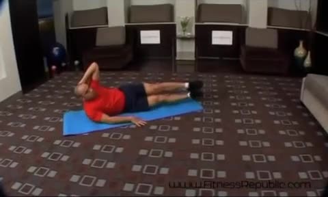 In oblique v-ups you have to lie down on your yoga mat and place your right side down. Place your right arm flat on the mat with the palm also in contact. Place your left hand behind your head with an elbow bent. Fasten your legs together especially your feet, with your knees locked in. Pull up your legs fastened together, at the same time pull up your shoulders; try to touch your left elbow to your left knee. And then back to the initial position. Oblique v-ups are