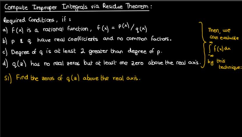 Welcome back to a new school year! In this video, I begin by defining the Cauchy Principal Value and proving a couple of theorems about it. Then, I use those theorems to establish a technique which may be used to evaluate improper integrals of certain rational functions, after which I conclude by applying this technique to a simple example.