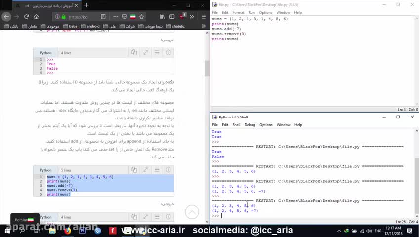 در این قسمت از سری آموزش زبان برنامه نویسی پایتون به بررسی نحوه استفاده از Setها در پایتون می پردازیم و با عملیات های منطقی رباضی بر Set ها آشنا می شویم. برای درک بهتر مطالب و تمرینات به وبسایت www.icc-aria.ir مراجعه نمایید