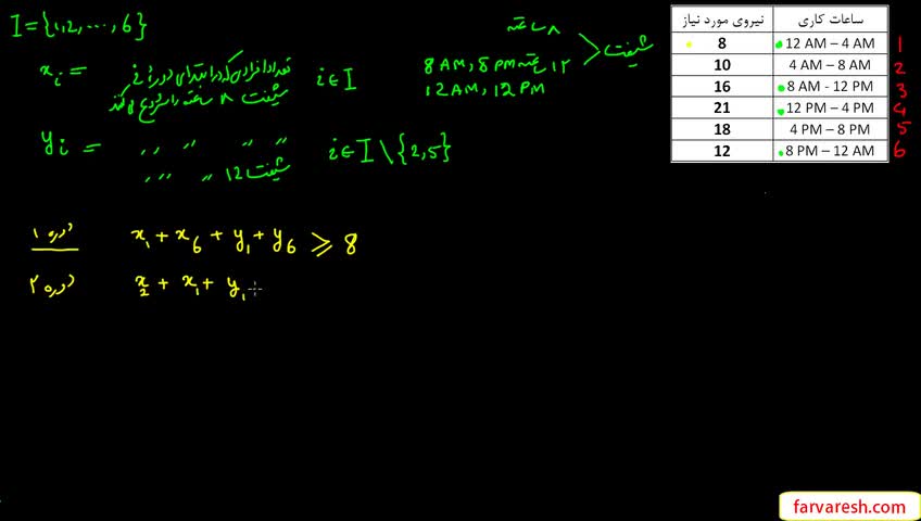 در این ویدیوی آموزشی، صورت بسیار ساده و پایهای از مسئله زمانبندی نیروی انسانی در شیفتهای مختلف شبانهروز به کمک برنامهریزی خطی (عدد صحیح) مدلسازی میشود.