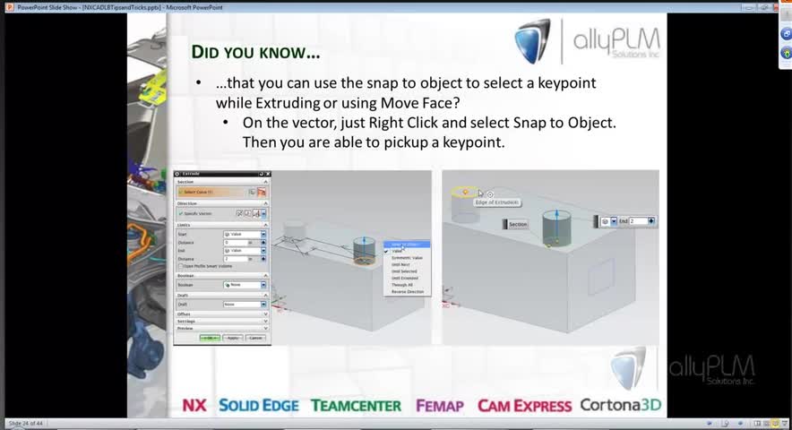 Welcome to another edition of the Ally PLM NX CAD Lunch Bytes - the topic we cover in this tutorial is Tips and Tricks. To register for upcoming lunch bytes ...