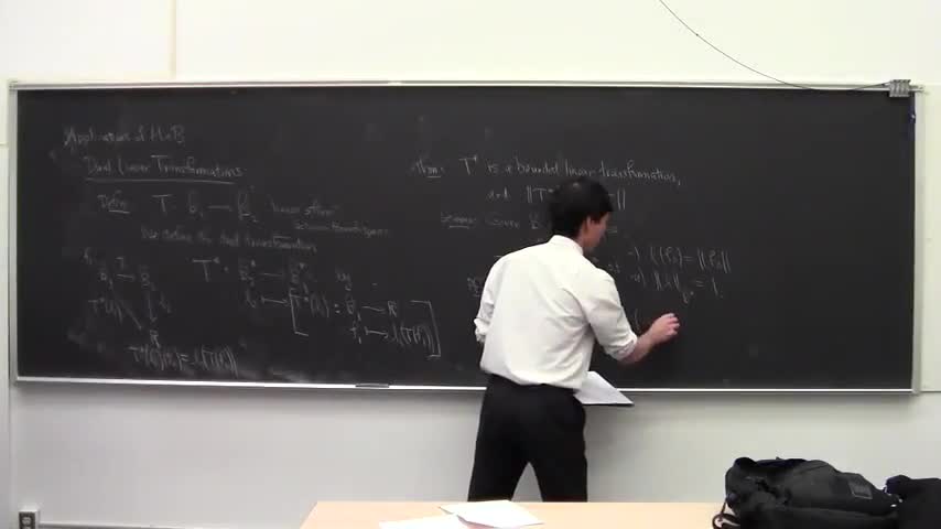 Statement of Hahn-Banach; proof; application to dual linear transformations; L^1 is not the dual of L^infinity.