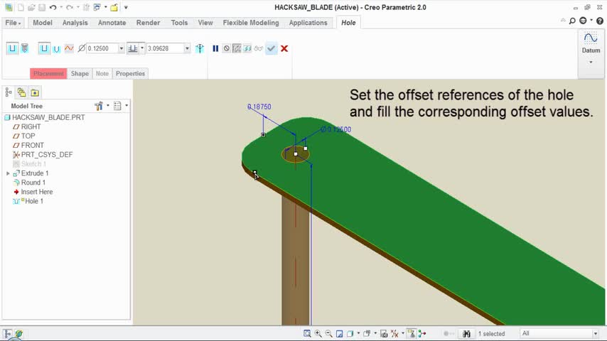 Creo Tutorial, 2D sketching, Creo, Hole, Round, Extrude, Creo 20 Tutorial, Hacksaw, Pattern, Tutorial, Creo Parametric, Creo Parametric 20 Tutorial, Creo Par...