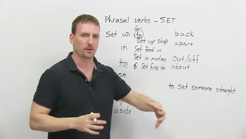 Hi. Welcome back to www.engvid.com. I'm Adam. Today's lesson is about phrasal verbs. We're going to look at the phrasal verbs with "set". Okay? Again, a phrasal verb is a verb and a preposition that together have a very different meaning than the two words individually. Okay? Not the literal meaning. So we're going to look at: "set up", "set in", "to", "on", "down", "against", "aside", "back", "apart", "out", "off", and "about"-those are similar so I put them together-and this is an idiom, it's not a phrasal verb, but I thought I would throw it in there: "to set someone straight".