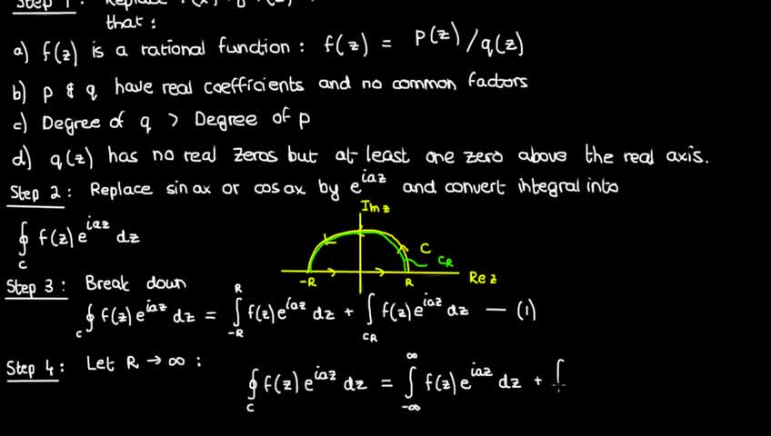 I begin by explaining the 5-step process in solving problems involving a Fourier integral (i.e. when you're integrating f(x)*cos(ax) or f(x)*sin(ax)) with infinite limits. After explaining the process, I apply it to a simple example problem.