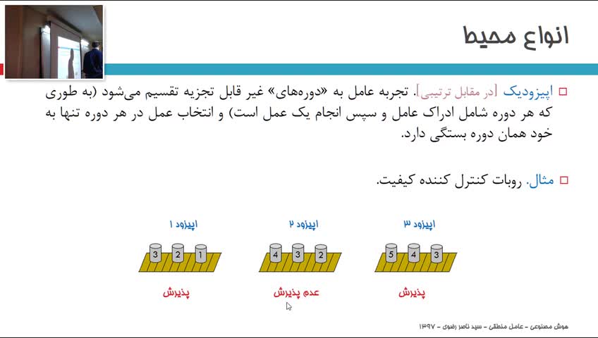 - ویژگیهای محیط: 00:06:08 - محیطهای مشاهدهپذیر و مشاهدهپذیر جزئی - محیطهای قطعی و اتفاقی - محیطهای ایستا و پویا - محیطهای اپیزودیک و عیراپیزودیک - محیطهای گسسته و پیوسته - محیطهای تک عاملی و چند عاملی