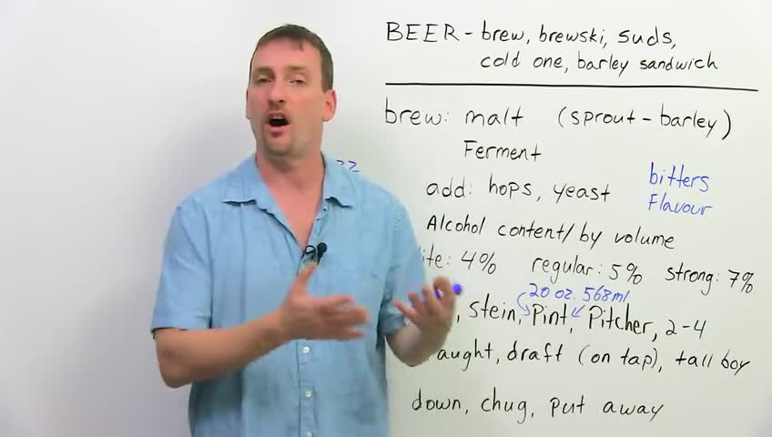 So, first of all, we have a few nicknames for beer. We could call it: "a brew", "a brewski", "suds", "a cold one", some people even call it "a barley sandwich". "Barley" is like a little grain, it's a cereal that you make beer with, so if anybody offers you a barley sandwich, they are offering you a beer.
