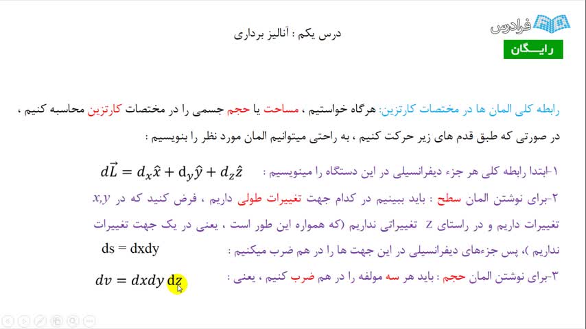 المان سطح و حجم در هر سه مختصات کروی، استوانه ای و کارتزین