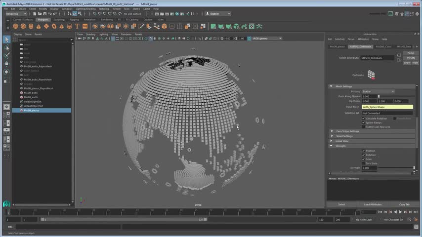 Maya, Autodesk, 3D, motion graphic, MASH, UI, reproductions, globe, pixels, mesh distribution, plexus, sphere, ring
