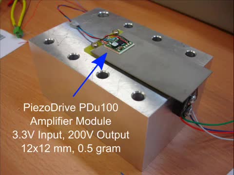 A miniature high voltage power amplifier was built and laminated onto a piezoelectric bimorph bender using thermally conductive adhesive. The resulting actua...