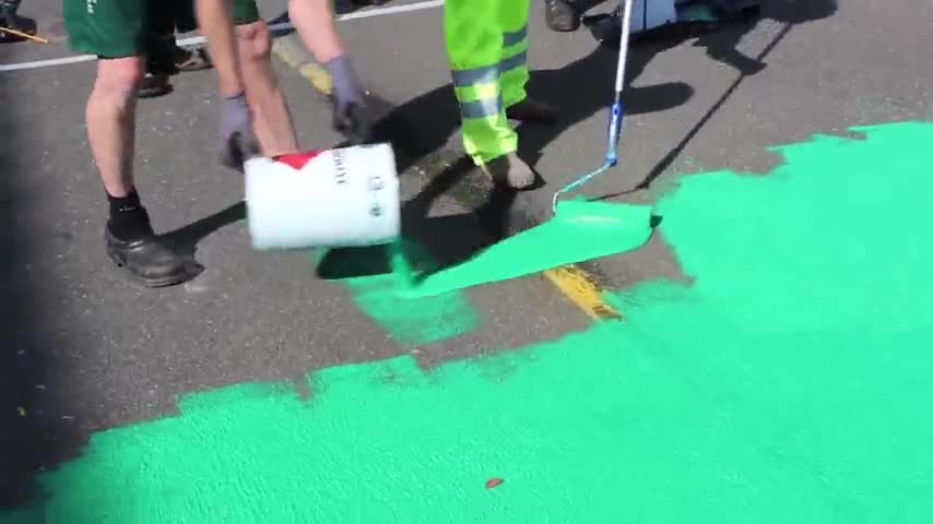 Application of PlastiRoute® RollGrip® 2 component cold plastic with high friction and PREMARK® preformed thermoplastic on top. PlastiRoute® RollGrip® is easi...