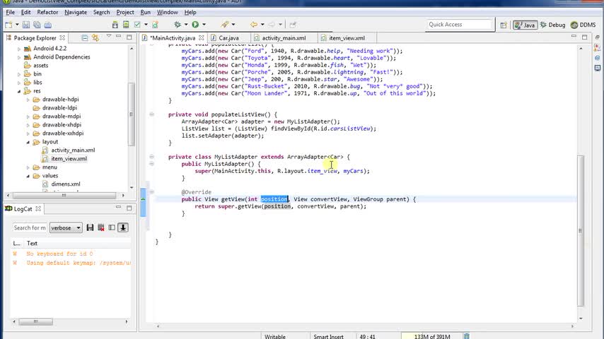 Create a ListView for Android applications which contains complex formats such as images and text. Populates the ListView from a List of objects. Full source...