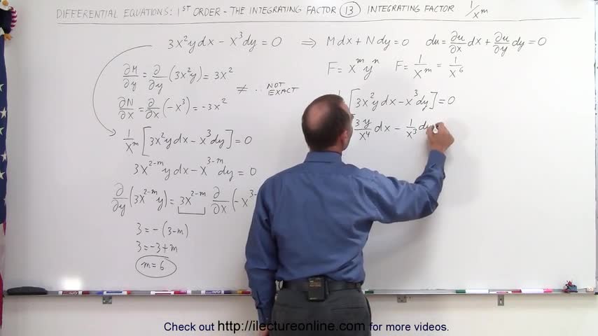 Visit http://ilectureonline.com for more math and science lectures! In this video I will solve 3(x^2)y-(x^3)dy=0 (non-exact requiring an integrating factor 1...