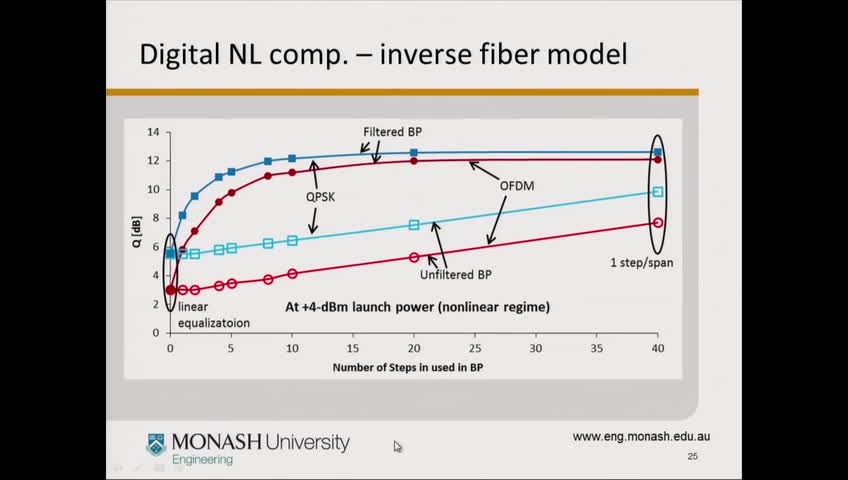 Alternatively, optical techniques can also be used to improve the nonlinearity-limited performance of optical systems. For example optical phase conjugation (OPC) can be performed near the mid-point of the link so the fiber nonlinearity products generated in the second half of the link mitigate the fiber nonlinearity products generated in the first half. There have also been end-link optical techniques proposed. Optical techniques have the advantage of being more scalable to multi-wavelength systems but require modifications to the external plant.