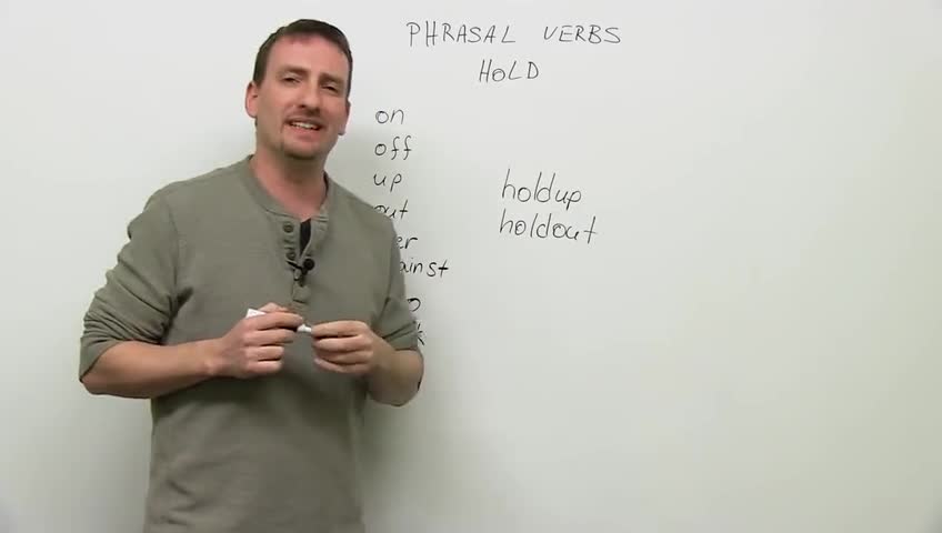 Hi again. Welcome back to www.engvid.com. I'm Adam. Today's lesson is, again, one of your favourites, phrasal verbs; everybody's favourites because they're so much fun and easy to understand. Today we're going to look at phrasal verbs with "hold". Okay? We have 10 of them. And again, what is a phrasal verb? Just to review. It is a verb, in this case: "hold", plus a preposition, when put together, have completely different meanings than the two words by themselves. So, let's start.