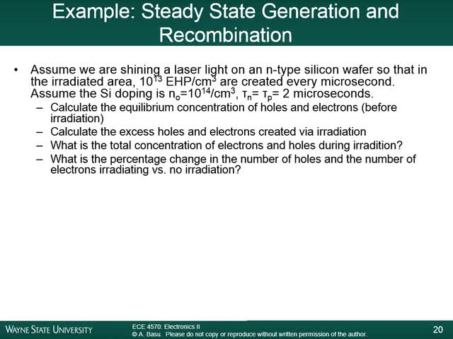 Transient, steady state, and equilibrium analysis. Carrier lifetime. Response of a semiconductor to a pulse of light. Temporal variation in carrier concentra...