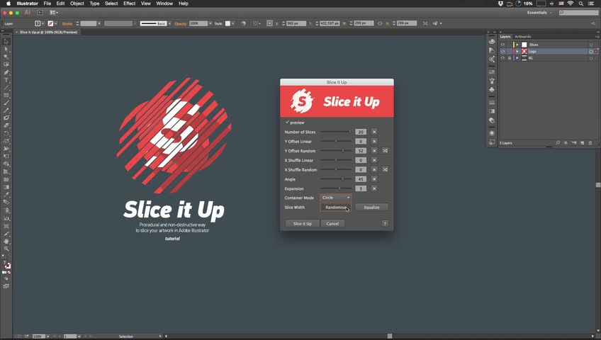 Procedural and non-destructive way to slice your artwork in Adobe Illustrator. Buy it with the AE (http://aescripts.com/slice-it-up/) or C4D (http://aescripts.com/slice-it-up-cinema-4d/) version for a 10% discount or all 3 for a 20% discount.