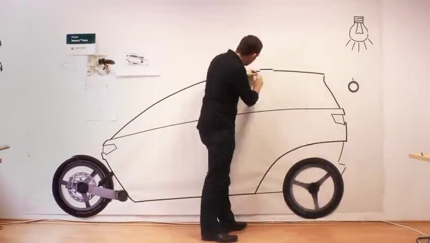 To get a feeling for the real proportions of the computer-designed electric vehicle, we created a 1:1 tape drawing on a plane surface. One of those jobs that...