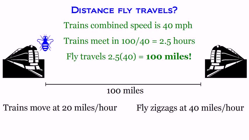 A fly, moving at 40 mph, zigzags back and forth between two trains, each moving at 20 mph. If the trains are 100 miles apart initially, how much distance wil...