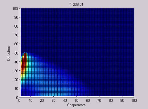 This animation shows the PDE solution of example 3 in Nielsen and Simon, "Numerical Animations of Group Selection Dynamics". See the text for details of the ...