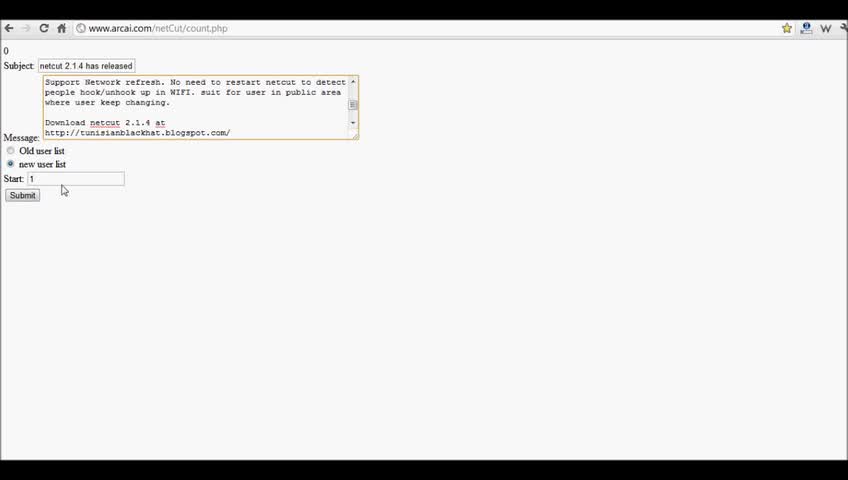 une vulnérabilité dans le site officiel de netcut www.arcai.com qui vous permet d'envoi de mailling a tous les membres de sites donc :-)))) fait plein de pub...