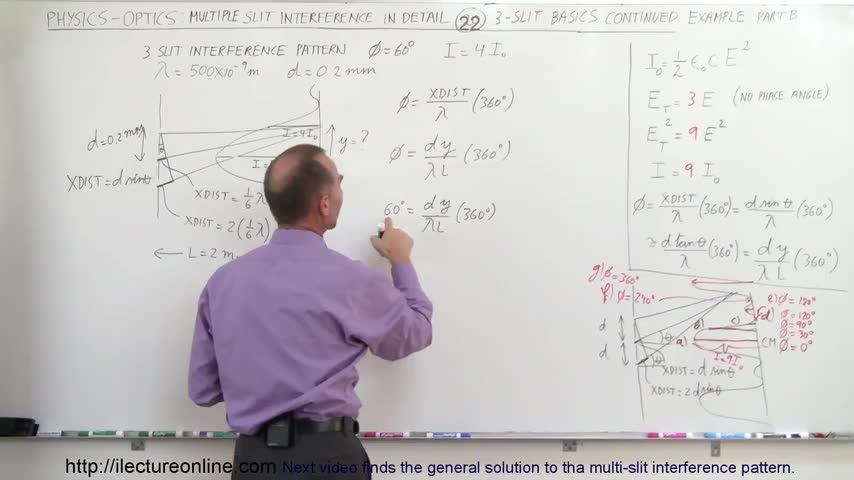 Visit http://ilectureonline.com for more math and science lectures! . In this video I will find y=? of a 3-slit interference pattern where the phase angle=60...