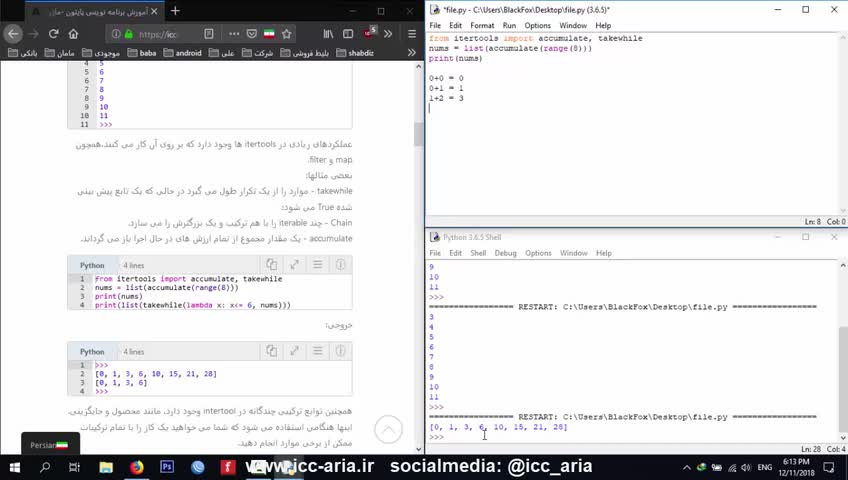 در این قسمت از سری آموزش زبان برنامه نویسی پایتون به بررسی نحوه استفاده از ماژول itertools و آشنایی با توابع مفید در داخل این ماژول می پردازیم. برای درک بهتر مطالب و تمرینات به وبسایت www.icc-aria.ir مراجعه نمایید.