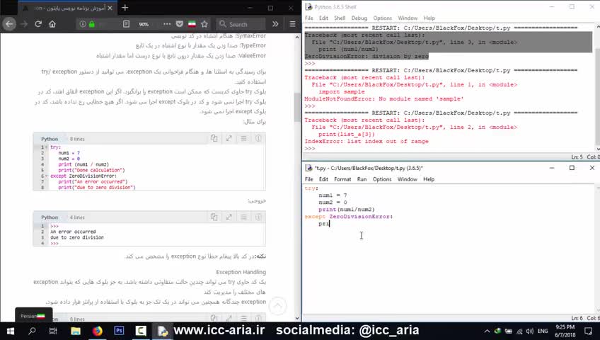 در این قسمت از سری آموزش زبان برنامه نویسی پایتون به بررسی نحوه برخورد با Exception و handeling خواهیم پرداخت. برای درک بهتر مطالب به وبسایت ما در www.icc-aria.ir مراجعه نمایید.