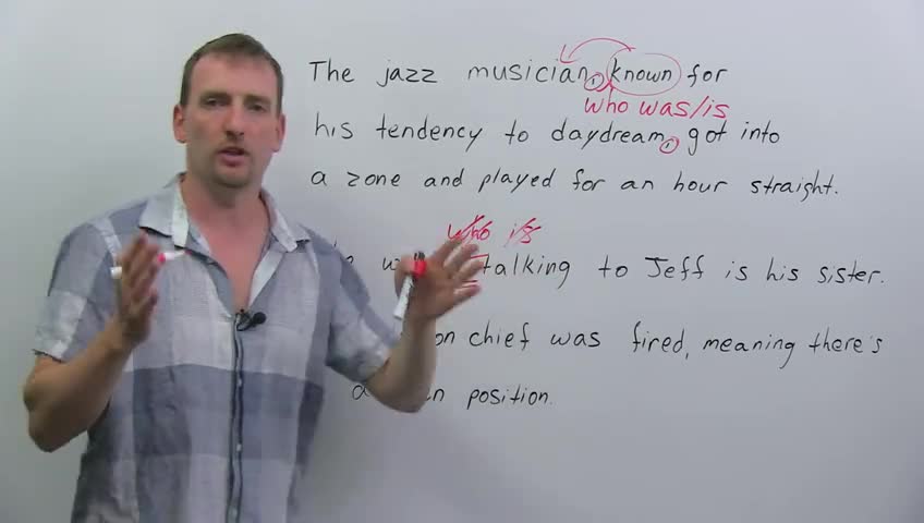 Okay, let's look at these examples now and you'll see the different positions the participles can take. And again, we're talking about participle phrases for the most part. "The jazz musician, known for his tendency to daydream, got into a zone and played for an hour straight." Okay? So what we're doing here, we're giving you a little bit more information about the musician. We're not identifying him. We're giving you extra information, which is why we have the commas.