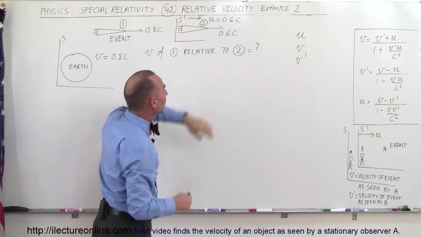 Visit http://ilectureonline.com for more math and science lectures! In this video I will find the velocity of 1 relative to 2 where v1=0.8c and v2=0.6c. Next...