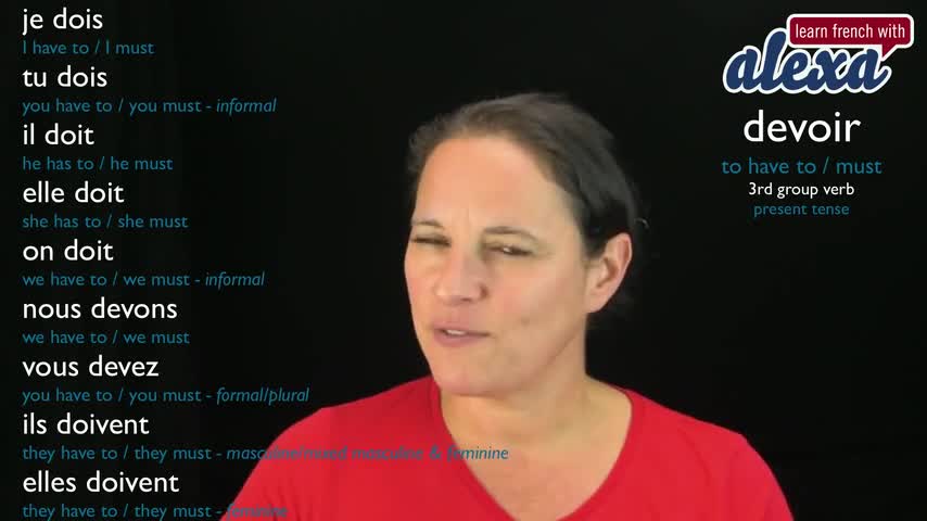 Alexa conjugates the French verb DEVOIR (TO HAVE TO/MUST) in the Present Tense. SUPPORT GUIDE and EXCLUSIVE VIDS at ► https://learnfrenchwithalexa.com ------...