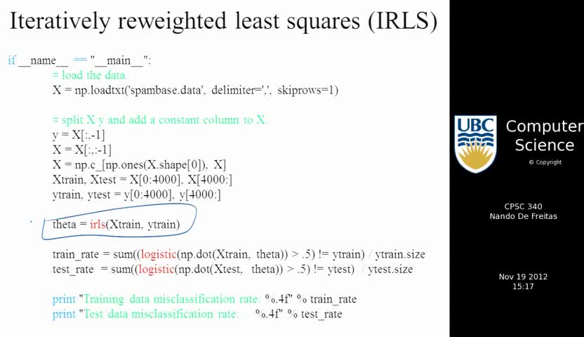 nando de freitas, machine learning, neural networks, logistic regression, gradient descent, gradient, Hessian, logistic function, sigmoidal function, IRLS, N...