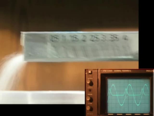 Oscilloscopic records: current of EVA (triangle waveform)-1A/c and displacement of load carrying elementof vibratory feeder (sinusoidal waveform)-1mm/c.TIME: 5ms/c