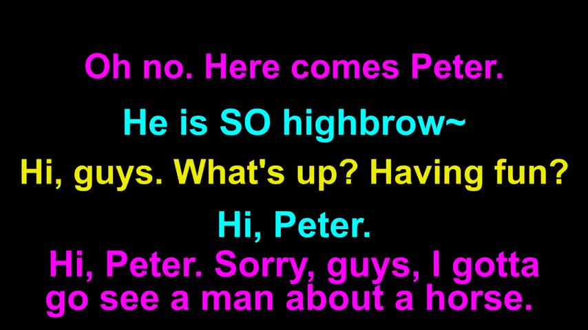 Today's E-cubed: see a man about a horse (dog) Oh no. Here comes Peter. He is SO highbrow~ Hi, guys! What’s up! Having fun? Hi, Peter. Hi, Peter. Sorry, guys...