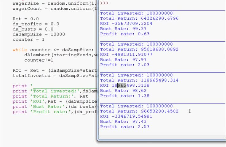 Here we compare the profit-ablity of the strategies. Not only does it matter whether or not we profit or go bust, it matters how much we profit when we do. I...