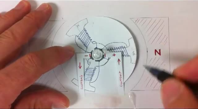 Step by step tutorial on how a 3-coil DC motor operates, focusing on what the commutator does in transferring current through the coils.