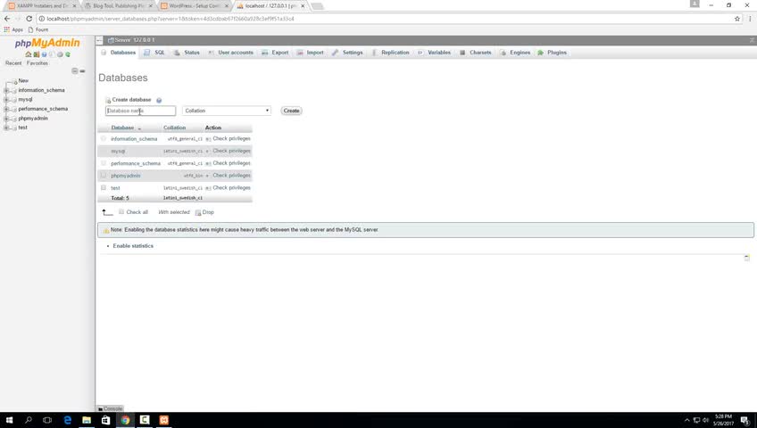 Now it will ask for a database, database username, and database password. This is something you will need to create in phpmyadmin. To do this, head to http://localhost/phpmyadmin