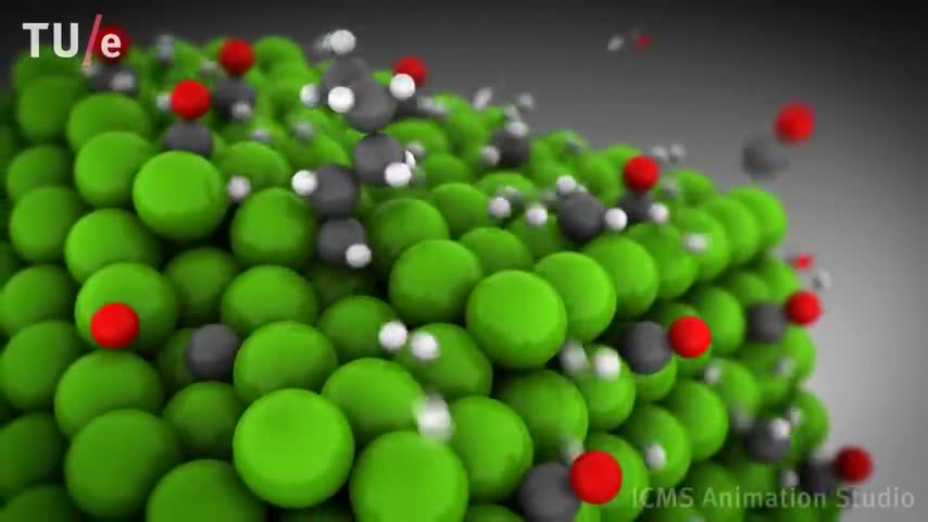 Animation showing the formation of hydrocarbon chains on surfaces of small ruthenium particles starting from carbonmonoxide and hydrogen gas. The carbon atom...