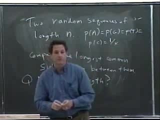 We discuss the expected length of the longest common subsequence between two random strings of lengths n each, and show that it grows linearly with n. This l...