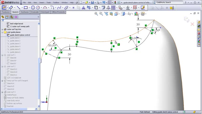 In this part, a master control sketch is created that will control the postion and angle of profile planes for the chair, rollover, and front surfaces.