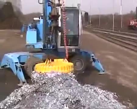 Circular lifting magnet, brand AdobA, type ADR 12,5 while lifting of scrap / punchings Runder Lasthebemagnet, Fabrikat AdobA, Type ADR 12,5 beim Umschlag von...