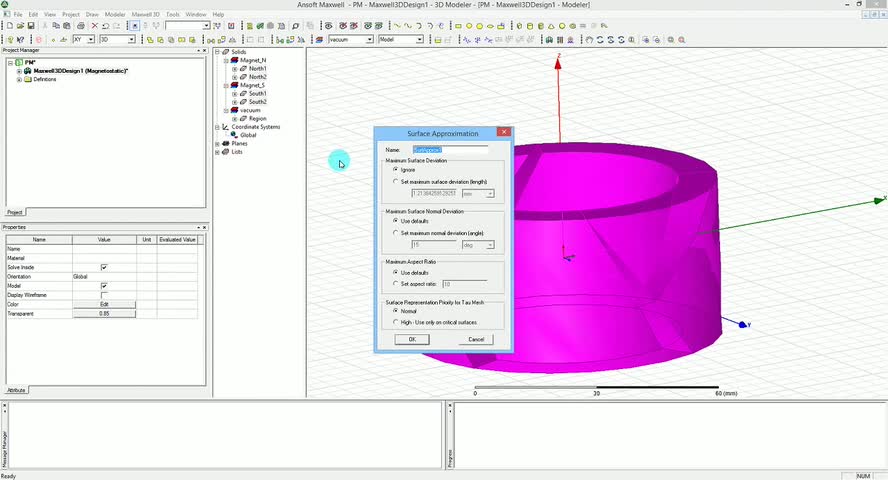 Ansoft Maxwell, Tutorial, EM simulations, Mesh initi, electromagnetic, Magnetoestatic, Ansys, Free, Permanent Magnet, Calculator, Surface approximation, elem...