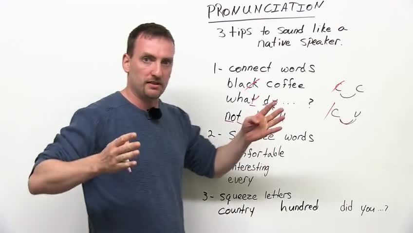 So we're looking at pronunciation. Let me start with this word: "pronunciation". Not: "pronounciation". It is not a pronoun. A pronoun is: "I", "me", "my", "mine". Pronunciation is how we speak English. So I'm going to give you three tips that will help you sound a little bit more like a native speaker. We're going to start with connecting words. Now, think about your own language, whether you're speaking Spanish or Polish or Chinese, you do this in your language as well. When you're speaking fast, you're taking words and you're squeezing them together; you're connecting them, so one word flows into the next word. That's what we're going to do here.