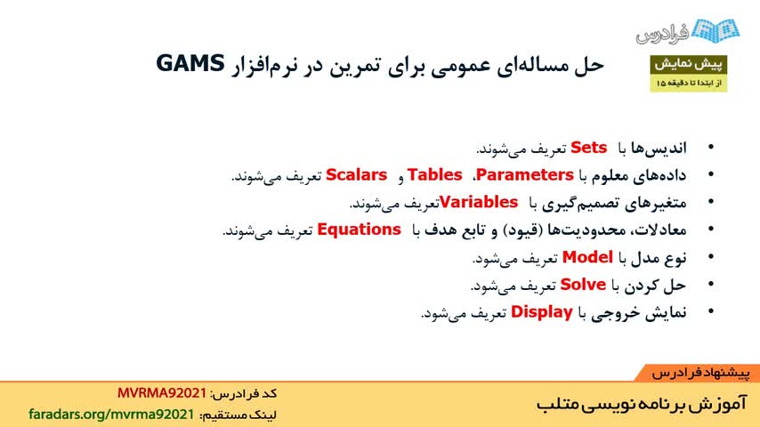 هدف از این بسته آموزشی، بیان ارتباط بین نرم افزارهای GAMS و MATLAB هست و عمداً وارد مدل سازی مسائل رشته تخصصی ویژه ای نمی شویم تا برای مخاطبان در هر رشته ای قابل استفاده باشد.