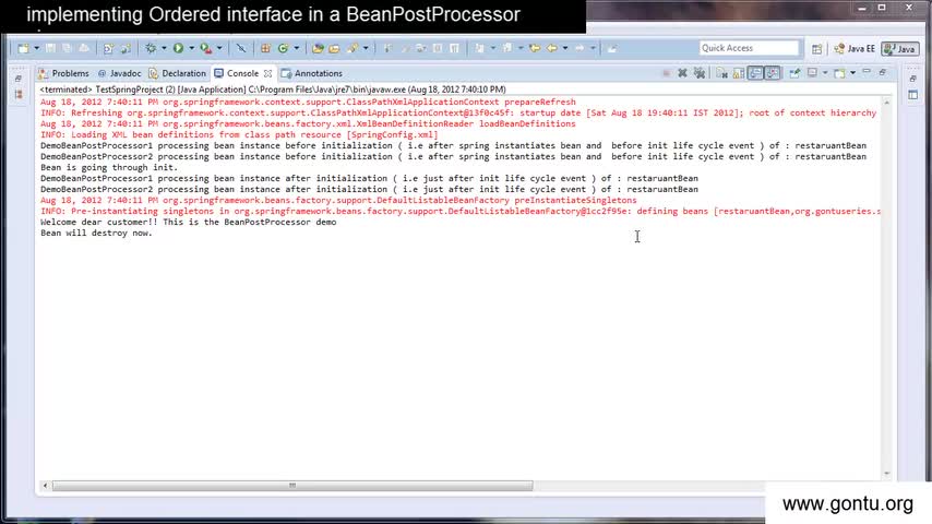 http://www.gontu.org In this tutorial, we will learn how to implement an Ordered interface in a custom written BeanPostProcessor class in your spring project...