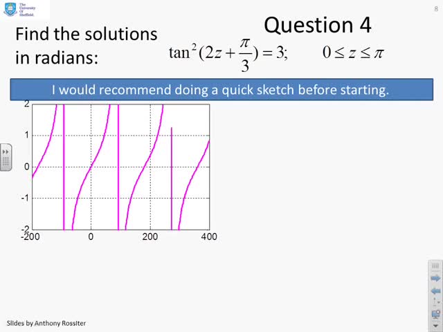 Introduces radians as a means of measuring angle. Gives a number of example problems to demonstrate how the problems tackled in videos 2-4 can equally be sol...