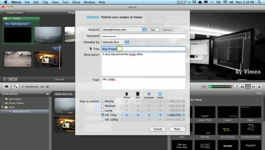 Learn how to export and share your video to Vimeo with iMovie See the lesson here for more details- http://vimeo.com/videoschool/lesson/39/video-101-exporting-and-sharing-to-vimeo-with-imovie