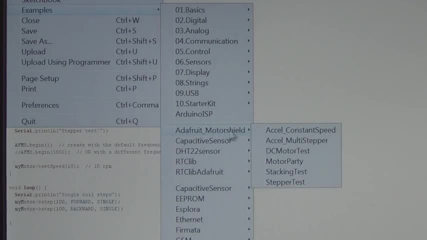 I assembled an Adafruit Motor Shield and tested it's Stepper motor capabilities with a 12V Stepper Motor