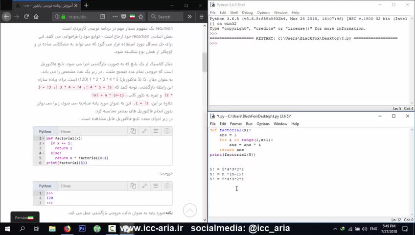 در این قسمت از سری آموزش زبان برنامه نویسی پایتون به بررسی نحوه استفاده از توابع بازگشتی در برنامه نویسی پایتون می پردازیم. برای درک بهتر و تمرینات به وبسایت www.icc-aria.ir مراجعه نمایید.
