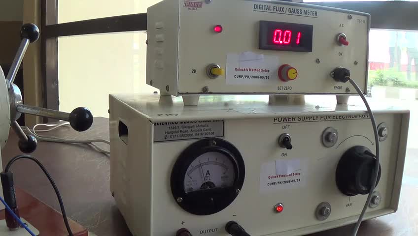 In this experiment we have used An electro magnet, its power supply, A Gauss Meter, along with a probe and Qunike's Tube (or U-tube) with FeCl3 solutions. By the help of Gauss Probe one can measure the magnetic field intensity (H) in the unit of Gauss. (1 Tesla= 10^4 Gauss).